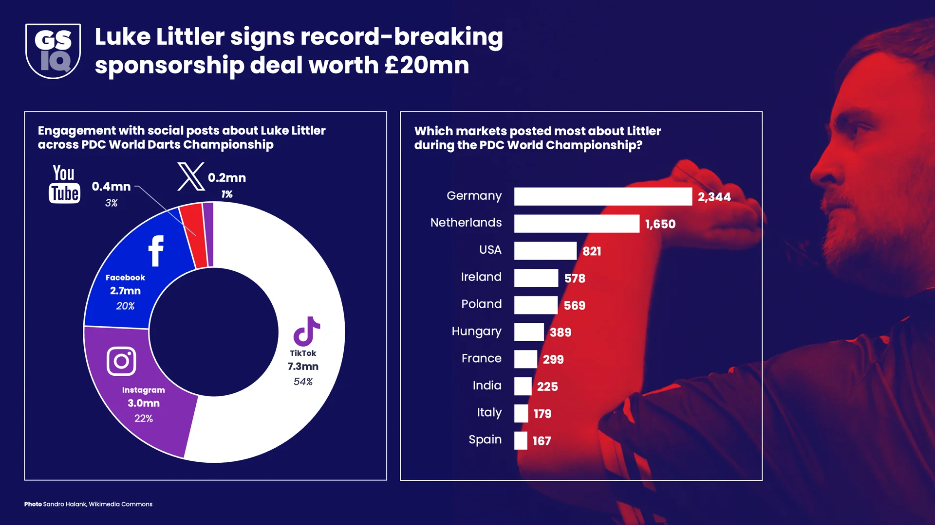 Darts may lack the global profile of, for example, football but Littler is someone who can change that. He, alone, was posted about 31,000 times during the recent PDC World Championship – including huge coverage outside the UK as highlighted in the chart below.